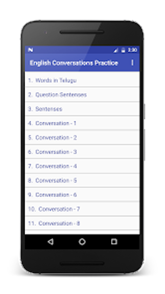 English Conversations Practice, Android platformunda kullanılabilen bir eğitim uygulamasıdır. Kullanıcılar, iki kişi arasında geçen günlük konuşmaları dinleyerek pratik yapma imkanı bulurlar. Uygulama, arkadaş tanıtma, çiçek satın alma, kütüphaneden kitap alma, otelde check-in yapma, oda servisi ile konuşma gibi çeşitli konular içermektedir. Ayrıca, birine nasıl rica edileceği, teşekkür etme yolları ve yaygın İngilizce cümleler gibi pratik konular da bulunmaktadır.
